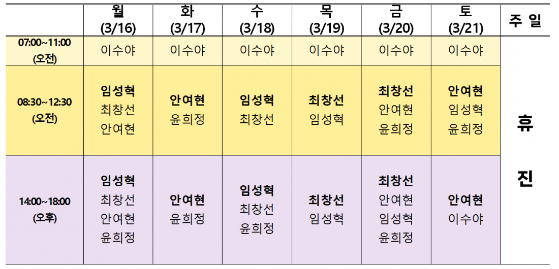진료시간표 2026년 3월 16일~2026년 3월 21일 ※이수야원장님 오후진료시 면역주사 접종은 실시하지 않습니다. ※대기환자가 많을시 조기마감 될 수 있습니다. 페이지 정보 본문